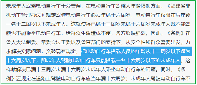 不过有的城市考虑到用车的方便,也允许电动自行车在16岁以下的未成年人,比如目前福建宁德、江苏等地的电动车管理条例,就是这样规定的。
