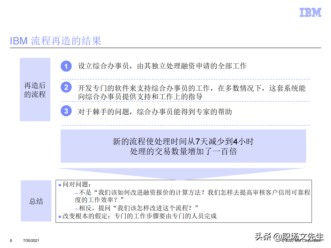 版权声明:我们致力于保护作者版权,注重分享,被刊用文章【企业流程再造案例(IBM流程再造的结果)】因无法核实真实出处,未能及时与作者取得联系,或有版权异议的,请联系管理员,我们会立即处理! 部分文章是来自自研大数据AI进行生成,内容摘自(百度百科,百度知道,头条百科,中国民法典,刑法,牛津词典,新华词典,汉语词典,国家院校,科普平台)等数据,内容仅供学习参考,不准确地方联系删除处理!;