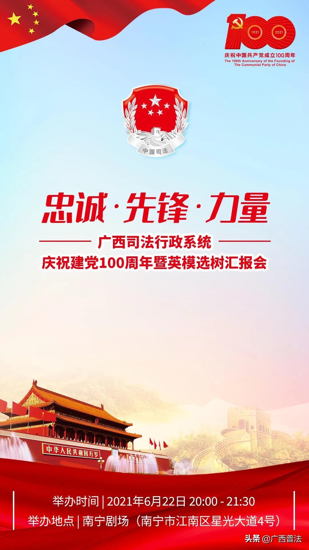 2021年是中国共产党成立一百周年,也是“十四五”开局之年,为努力打造堪当时代重任的司法行政铁军,自治区司法厅将组织举办庆祝建党100周年暨司法英模选树汇报会,用汇报会的形式坚定广西司法人对党忠诚的政治品格,丰富和活跃司法行政系统的文化氛围,激发和释放司法行政队伍内生动力和发展活力,全身心投入新时代广西司法行政改革创新发展,为“建设壮美广西共圆复兴梦想”提供优质的法律服务、良好的法治环境、有力的法治保障,以优异的成绩庆祝建党100周年。