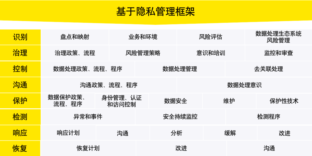 各行各业的隐私管理重点和需求各有不同,因此选择哪种隐私管理方法能够满足不断发展和变化的隐私管理活动尤为重要。考虑隐私管理的充分性和可定制性,我们选择NIST隐私框架作为隐私管理与安全开发的基础管理框架(如图2所示),包括隐私管理相关的识别、治理、控制、沟通、保护、检测、响应和恢复活动。