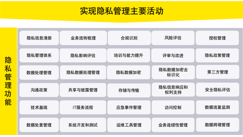 建设全面、规范的隐私管理活动目录,能够帮助企业将业务活动和隐私管理活动相结合的同时,使各相关人员明确在业务活动中承担的隐私管理责任,使隐私管理团队能够更好地收集隐私管理相关的记录和证据,当需要隐私控制和隐私处置时,均能识别相关的关键点和问题点。