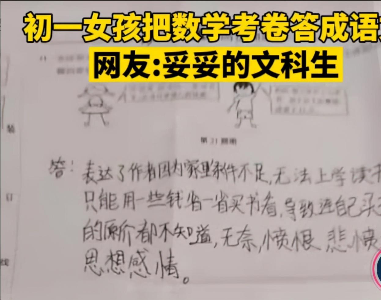 这是一位初一女生的数学试卷,对的,你没有看错,就是数学试卷,但是这答题的方式仿佛是在做语文的阅读理解。