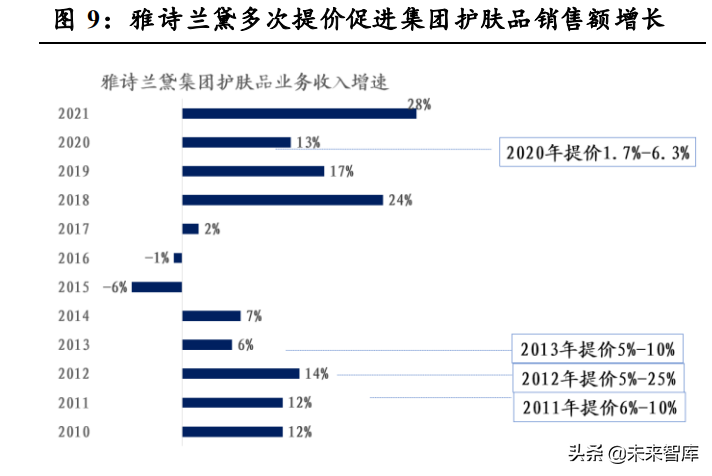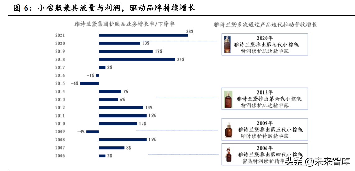 3)代理品牌提升知名度:一方面相较于自主研发品牌较长的开 发周期,通过代理品牌集团可以实现高频推新、提升曝光度,另一方面通过代理可以 收购代理品牌的忠实客群,快速积累新业务,节省了重新打造新品牌的流程。雅诗兰 黛集团代理的品牌均为轻奢或奢侈时装品牌合作开发的香水、美护产品线,至此雅诗 兰黛已从单一品牌公司成长为行业顶端的高端化妆品集团。(报告来源:未来智库)
