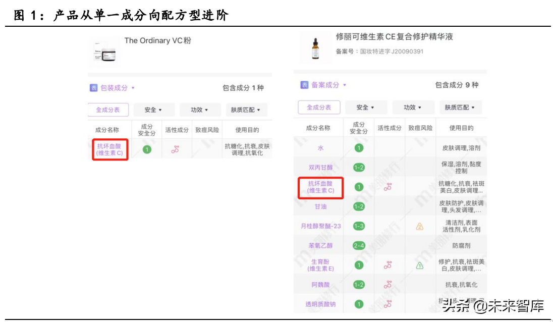 现阶段,化妆品产品配方的重要性大于成分。消费者从注重产品的某种单一成 分的较高浓度,逐步深入关注有效浓度、安全浓度,并且焦点也已转移至专业有效的 配伍。以注重成分添加的品牌商修丽可、HFP 为例,修丽可旗下产品主打科学配方, 目标定位高端市场,而 HFP 旗下产品多为原料桶护肤品(追求最高量的活性物添加), 目标定位中低端市场, 我们从国内市场观测到近年来修丽可增长动力强劲,根据欧 睿数据显示,2016 年修丽可销售额不到 HFP 的 3 成,2020 年修丽可销售额已上升至 HFP 的 4 成,且 2019、2020 年修丽可销售额 CAGR 为 120%+,增速远快于同期 HFP 约 55%的水平,由此可见 2019 年起至今消费群体正重视产品配方而非简单追求成分。