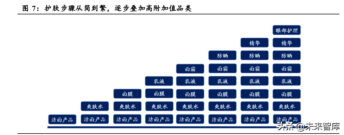 消费者对于肌肤的护理需求,以及对于面容的日常妆饰需求,共同决定了化妆 品的功能属性。化妆品的护肤功能可分为清洁、基础保养、特殊功效三大类,每一类 功能对应的护肤品质地各异且需配合不同的护理手法,因此横向上来看针对肌肤的全 方位护理通常步骤繁多,而在纵向上亦有功效的进阶,一般遵循维稳—保湿—美白— 抗衰的升级路径。化妆品的妆饰功能则主要通过彩妆品来实现,完成整个面部的妆饰 通常需要底妆、定妆、修容、眼妆、唇妆等 5 大步骤,且每一步骤内均涉及不同功能 的配套产品,如底妆步骤中包括隔离、防晒、粉底液、遮瑕等 4大产品类型,而这些 产品又可以进一步细分至不同产品形态,如遮瑕可进一步细分成遮瑕膏、遮瑕棒、遮 瑕液、遮瑕笔等多种形态以作用于不同精细部位(遮瑕膏可用于遮盖黑眼圈,遮瑕液 可用于嘴角或鼻翼提亮)。