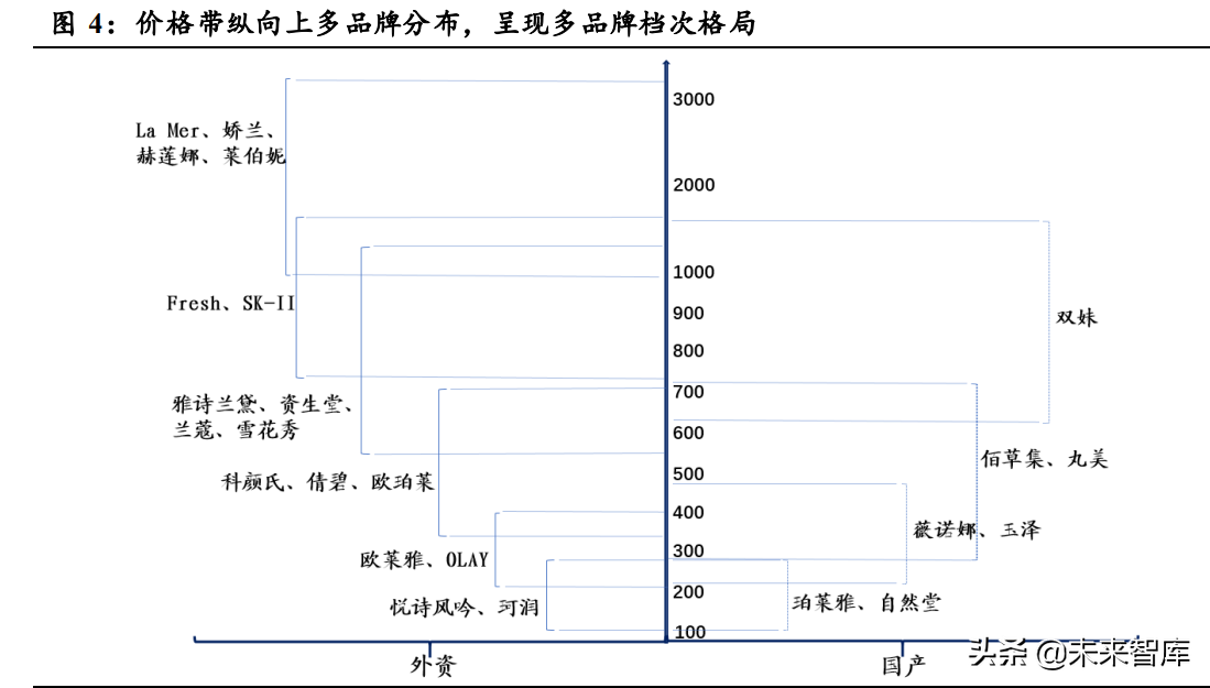 鉴于单一品牌天花板有限,化妆品企业在成功孵化单品牌后,通常会进阶至以 多品牌矩阵为核心的集团化发展,我们认为行业价格带纵向上的多品牌档次,叠加 横向上的多品牌定位,共同构成了化妆品企业布局多品牌矩阵的必要条件。综合化 妆品的三大品种属性来看,在任何一个属性维度上都能延伸出繁多细分需求,行业需求端的高度个性化奠定了供给端的多品牌格局。一方面,化妆品的高度个性化使得各 大化妆品品牌能清晰地找到与自身定位相对应的档次,不同价格带上均有品牌覆盖; 另一方面,即使在同一价格档次上,不同客群或因年龄层次、生活习惯、审美品味各异而有不同需求,特定价格带上又会分裂出定位各异的品牌。