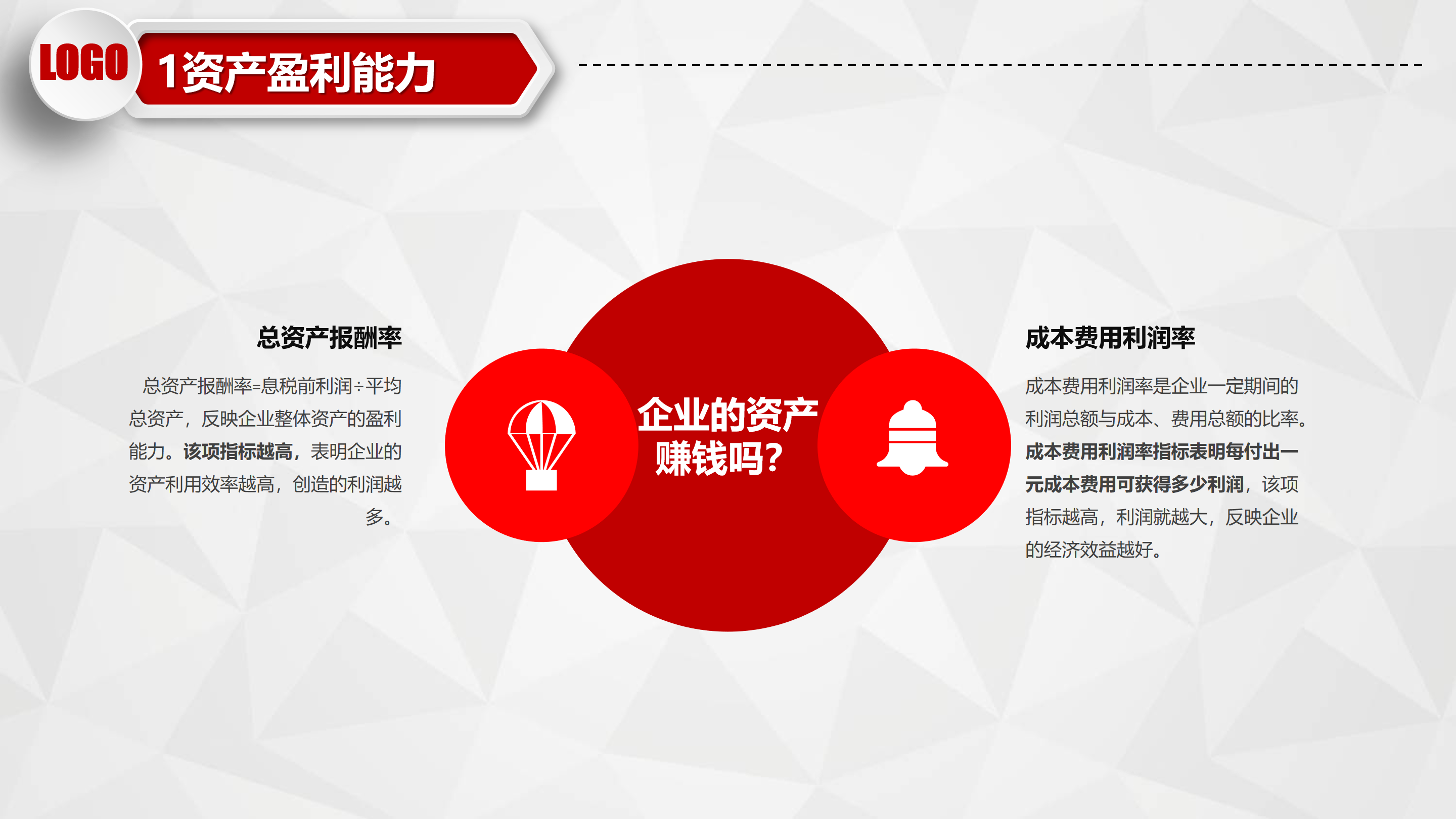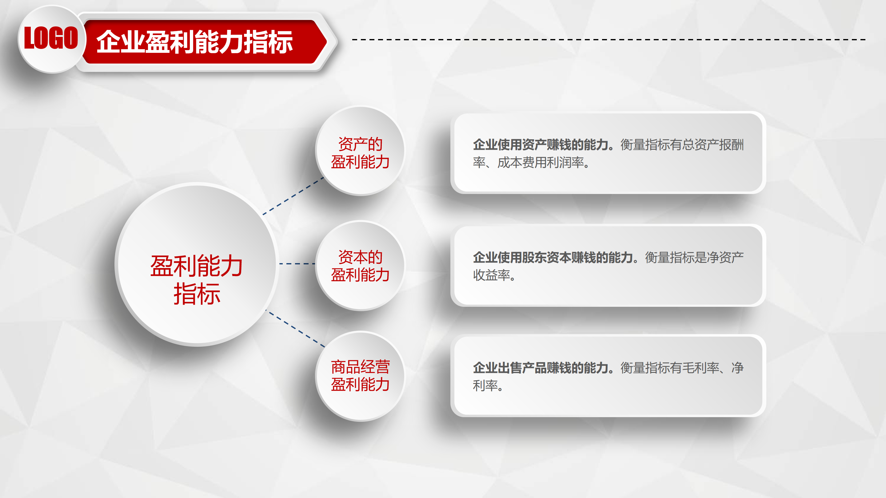 所谓的盈利能力指的就是企业赚钱的能力。企业赚钱的能力分为三部分:即资产赚钱的能力、资本赚钱的能力以及商品经营赚钱的能力。这里面涉及到很多的财务指标。大家可以看后面的PPT。