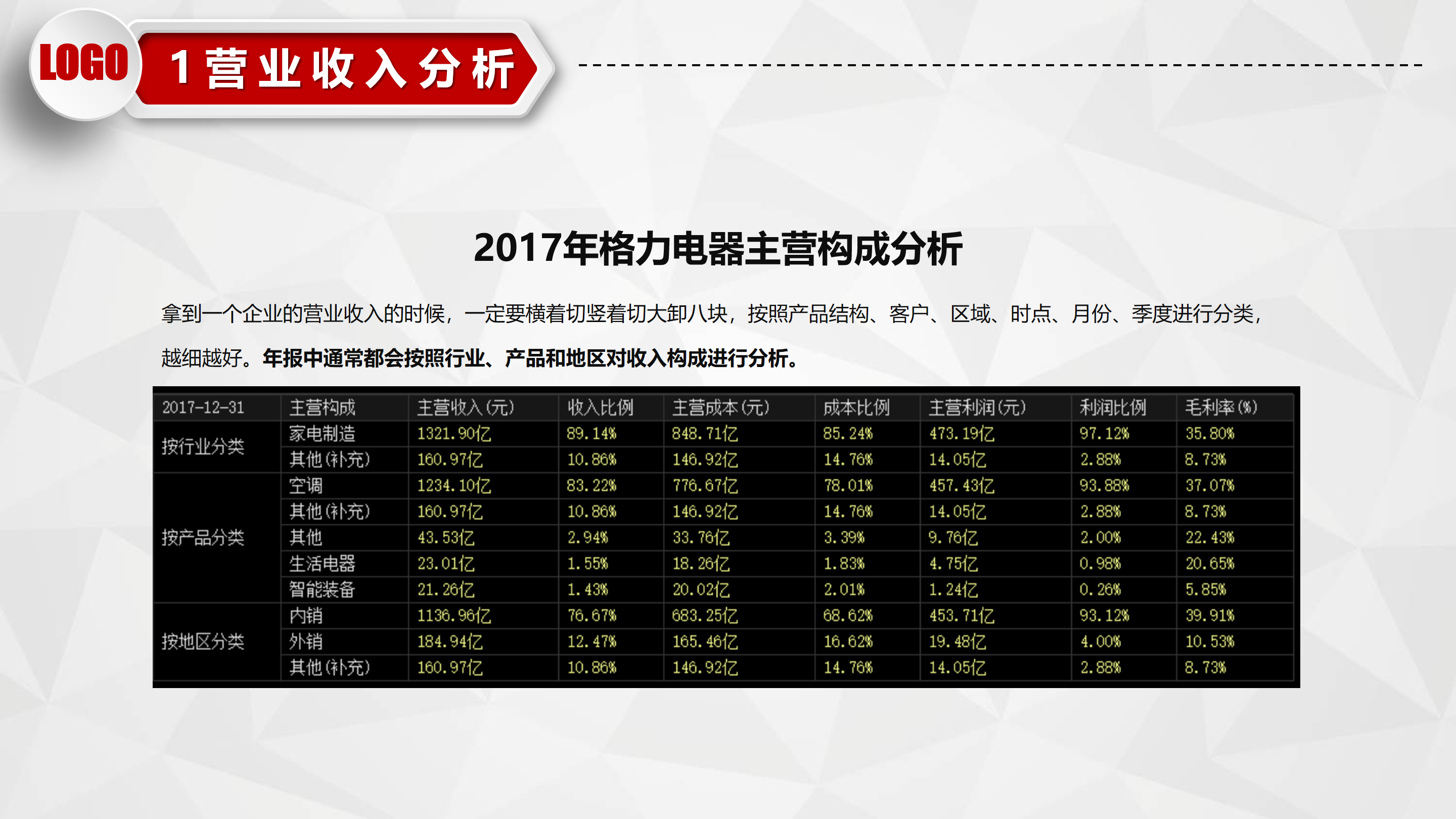 营业收入可以按照品种构成进行分析,很多企业都采取多品种多元化经营方式,但不同产品的毛利率和对收入的贡献是不一样的,我们要着重分析企业的关键产品;