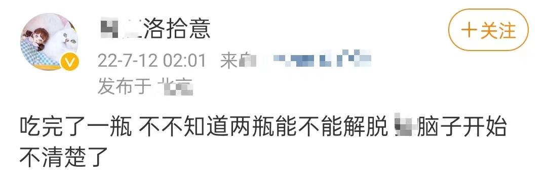 吃完一瓶药之后,洛拾意发文称自己脑子已经开始不清楚了,当时她还想着吃两瓶药来个彻底解脱。