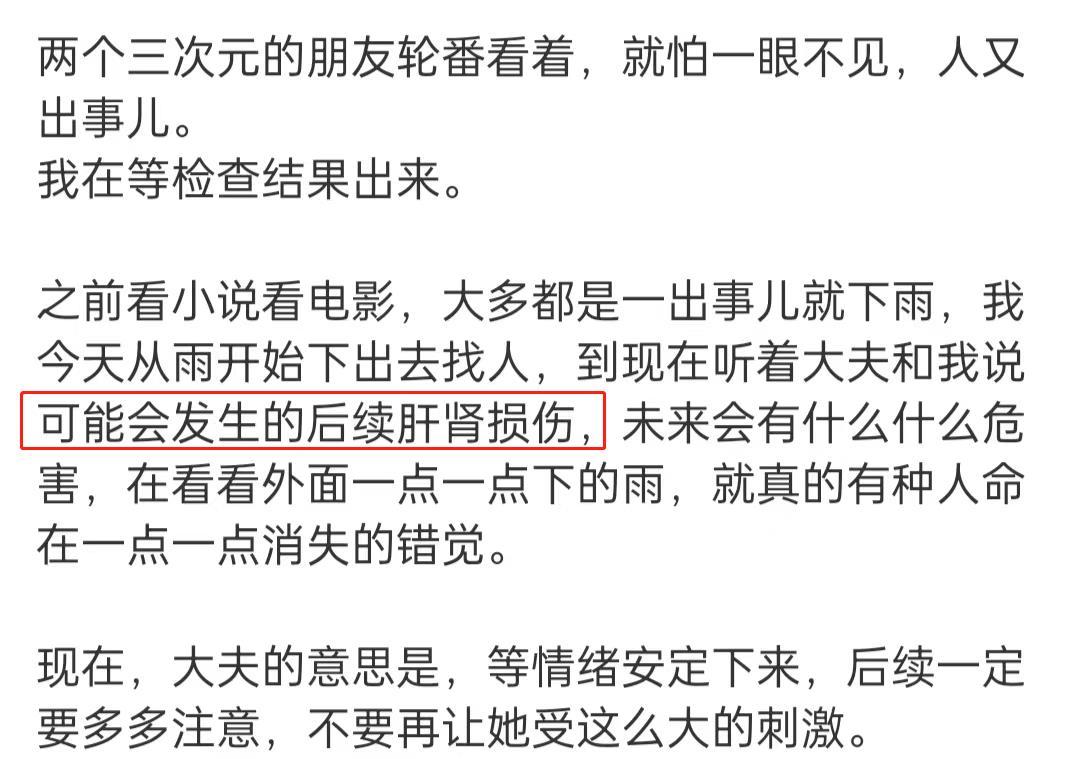 虽然事后洛拾意在朋友的劝慰和照顾下接受了治疗,目前已经脱离了生命危险,但她吃的两瓶药对身体伤害很大,可能会有后遗症,而且她现在的情绪非常不好,医生也强调一定不要再让她受刺激了。