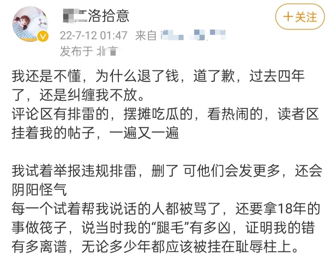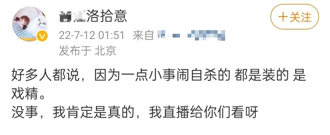 长时间遭受网络暴力的洛拾意不堪重负,于7月12日凌晨在社交平台上发文讲述了自己遭受的一切,并称自己累了,打算“解脱”了。