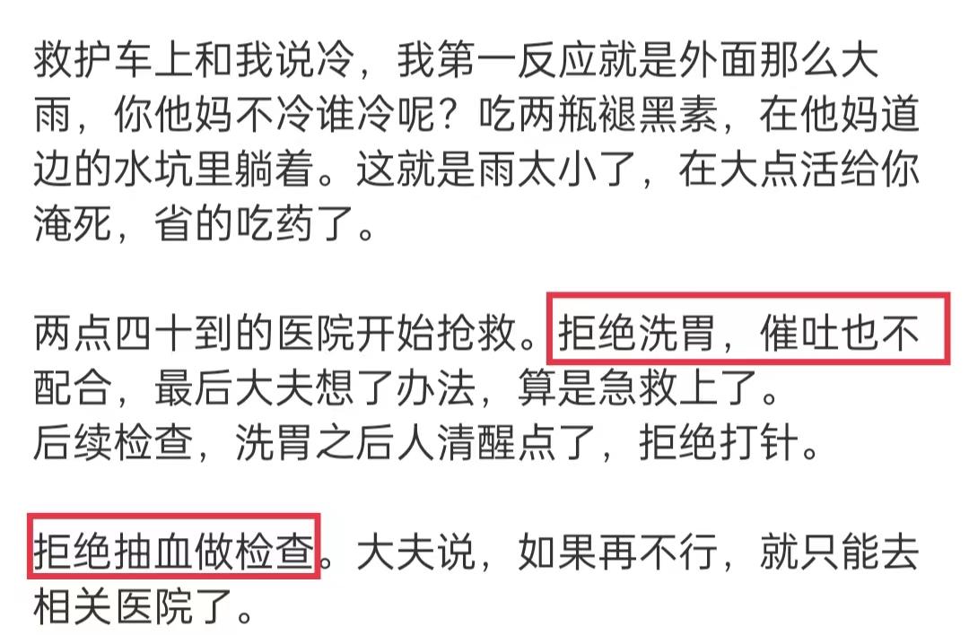 好在最后洛拾意的朋友和警察一起找到了她,当时她吃了整整两大瓶药,躺在路边的水坑里,朋友们连忙将她送去医院急救。