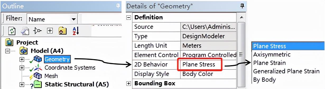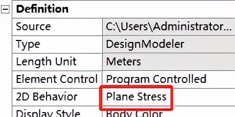 进入Mechanical,设置Geometry属性中的2D行为(2D Behanior),可设置选项有:平面应力Plane Stress(默认)、平面应变Plane Strain、轴对称Axisymmetric、一般的平面应变Generalized Plane Strain、基于几何体 By Body等。