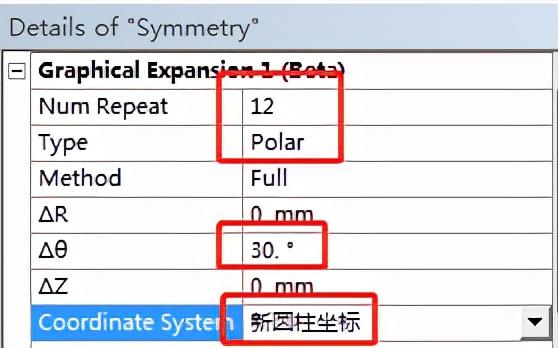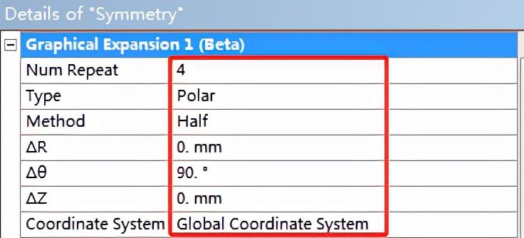 回到Mechanical,选择特征树中Symmetry,设置属性Graphical Expansion1(扩充显示1):Num Repeat(重复数量)都设置为4,Type都设置为极坐标Polar,Method设置为Half(一半),△R与△Z均设置为0(默认),△θ设置90°,Coordinate System均选择默认的全局坐标系。