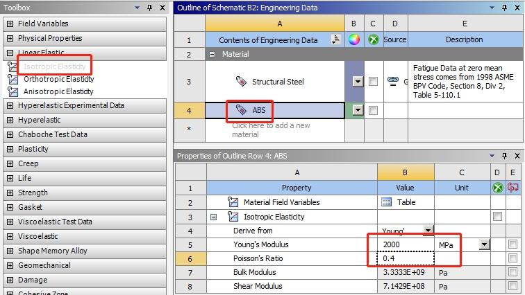 材料设置:选中特征树中的模型,在属性中的Assignment中选择下拉菜单——New Material,进入工程材料库,新建ABS材料,弹性模量2000MPa,泊松比0.4。退出工程材料界面,返回Mechanical。点击File——Refresh All Data,刷新所有数据,再次选中特征树中的模型,赋予刚才添加的ABS材料。