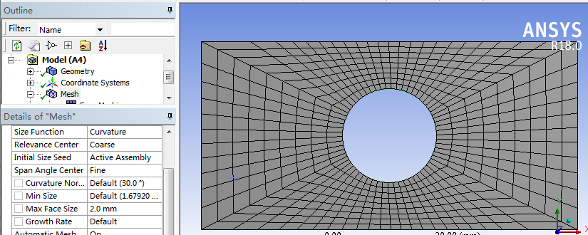 划分网格:设置全局网格下Max Face Size:2mm。添加映射网格(Face Meshing),映射平面选择曲面。