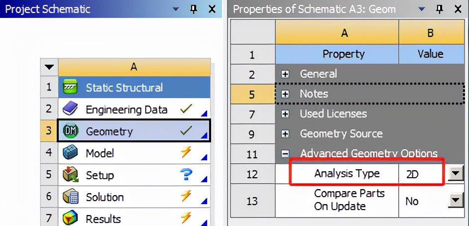在WB界面新建静力学模型,点击项目的Geometry栏,设置属性Analysis Type为2D。
