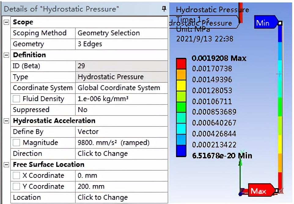选择水杯内壁边,设置静水压力,注意箭头方向朝上,水密度1e-6kg/mm²,水面设置在水杯的杯口处。