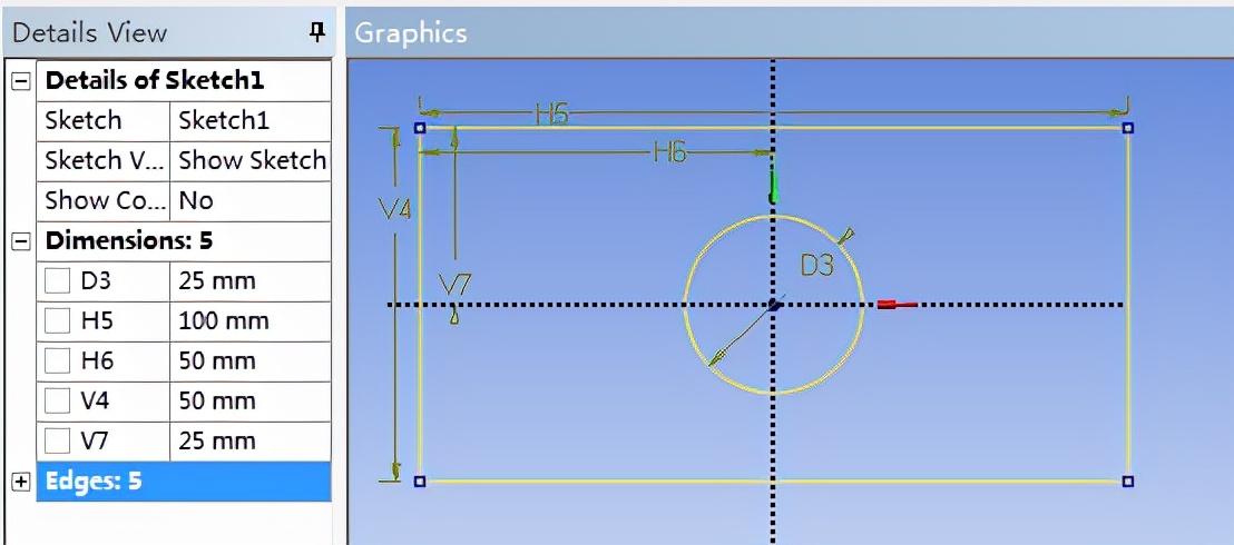 右击Geometry——New DesignModeler Geometry....,进入DM界面。在XY平面绘制矩形100mmx50mmx,中心孔Φ25mm。注意必须在XY平面
