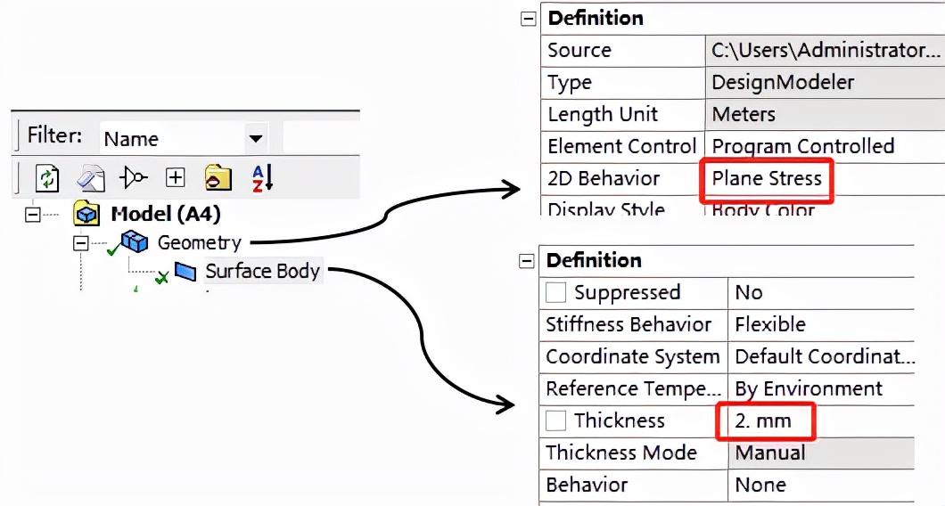 设置零件行为:点击特征树Gemetry,设置属性2D behavior:Plane Stress(默认选项)。选择特征树下的曲面,设置属性中曲面厚度Thichness:2mm。设置材料为默认的结构钢。
