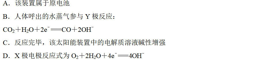 解析 该装置实现了太阳能→电能→化学能的转化,而将电能转化为化学能属于电解池,A项错误;由图可知Y极发生的是得电子的反应,人体呼出的气体中含有CO2和H2O,B项正确;由得失电子守恒原理知,X极消耗的OH-总量等于Y极生成的OH-总量,即电解质溶液的碱性没有改变,C项错误;从电子的流向看,X电极失去电子,故X电极是负极,电极反应式为4OH--4e-===2H2O+O2↑,D项错误。