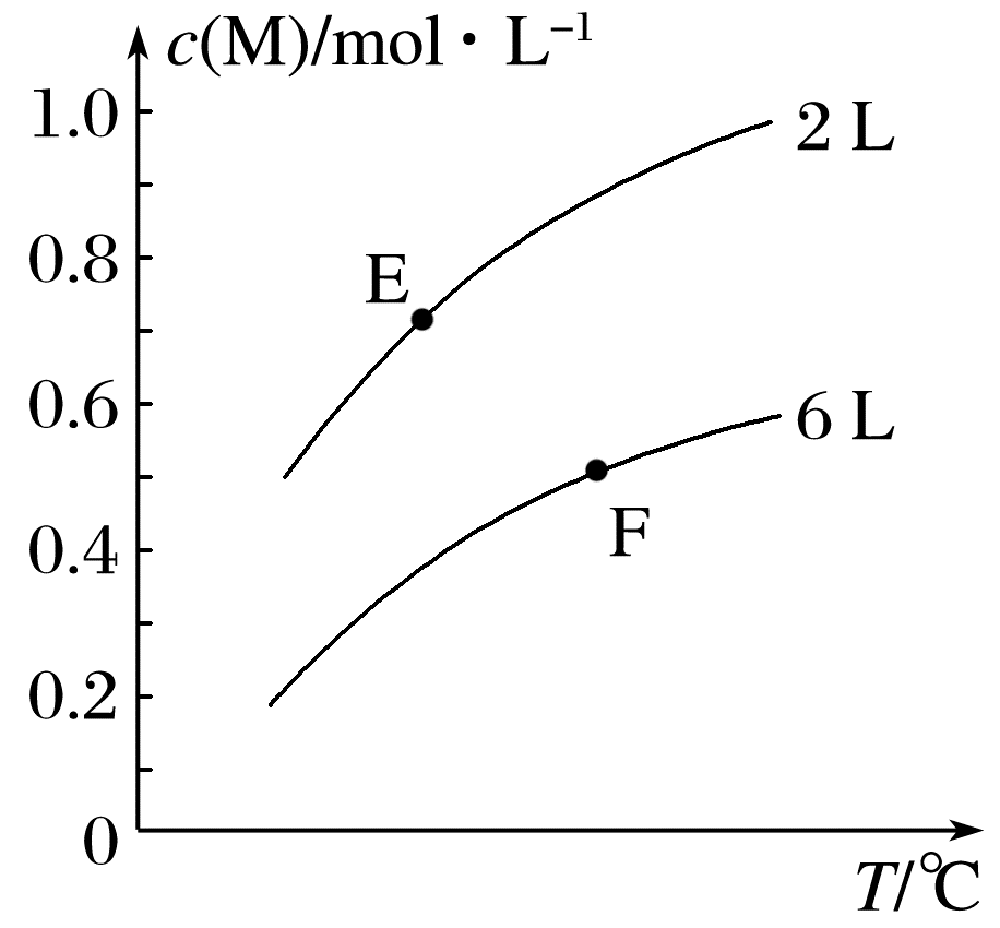 解析 容器容积不变的情况下,随着温度的升高,M的平衡浓度逐渐增大,说明平衡正向移动,正反应为吸热反应,故Q>0,B项错误;在同温度下,比较两条曲线上某两个点,比如就比较两个曲线的起点,可知当容器容积缩小到原来的三分之一时,M的平衡浓度没有增大到原来的三倍(0.6mol·L-1),而是0.5mol·L-1,说明平衡逆向移动了,故a+b<c+d,A项错误;由E点到F点,温度升高、压强减小,这两个改变条件均有利于平衡正向移动,故E点X的转化率<F点X的转化率,C项错误;对于吸热反应,温度越高,平衡常数越大,所以F点的平衡常数肯定大于E点的平衡常数,D项正确。
