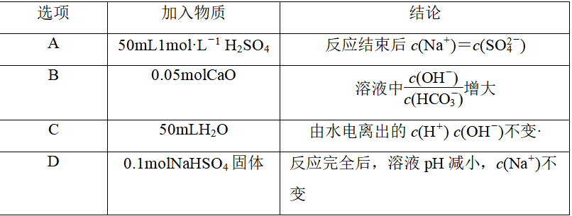 增大,正确;C项,加入50mLH2O,CO的水解平衡正向移动,但c(OH-)减小,溶液中的OH-全部来源于水的电离,由水电离出的H+、OH-浓度相等,故由水电离出的c(H+)·c(OH-)减小,错误;D项,加入的0.1molNaHSO4固体与0.05molNa2CO3恰好反应生成0.1molNa2SO4,溶液呈中性,故溶液pH减小,加入NaHSO4,引入Na+,所以c(Na+)增大,错误。