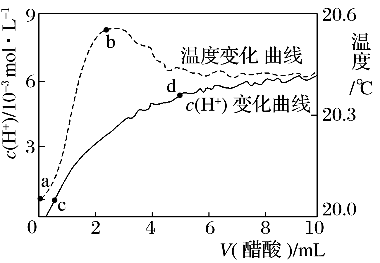 8.室温下,将10.00mL5.00mol·L-1醋酸滴入100.00mL蒸馏水中,溶液中c(H+)和温度随醋酸体积变化的曲线如图所示。下列有关说法正确的是( )