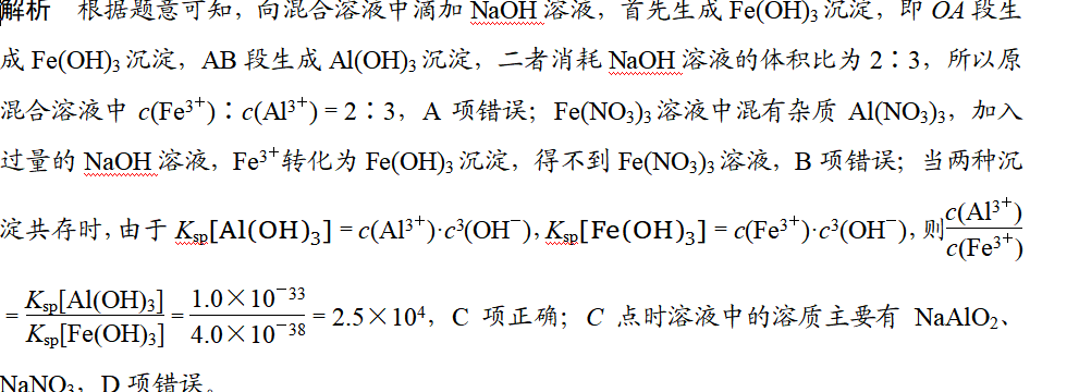 解析 审题时抓住两条信息:一是溶度积大小;二是金属离子浓度相等。依题意,与NaOH溶液反应的先后顺序为Al3+>Mg2+>Al(OH)3。A项,Al3+未完全生成沉淀,Mg2+不会生成Mg(OH)2沉淀,错误;B项,Mg2+没有生成沉淀,不会生成AlO,正确的离子方程式为Al3++Mg2++6OH-===Mg(OH)2↓+AlO+2H2O,错误;D项,Mg2+完全生成沉淀后,Al(OH)3才开始转化成AlO,错误。