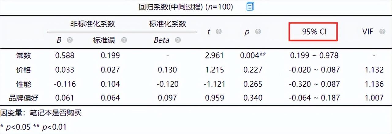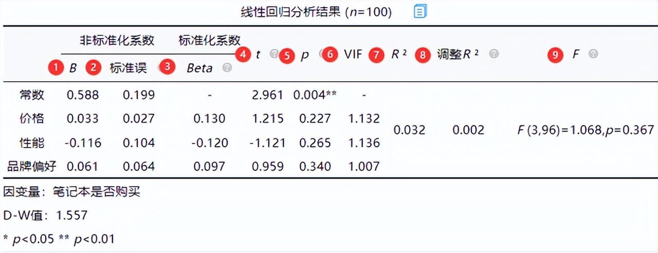 从上表可知,将价格,性能,品牌偏好作为自变量,而将笔记本是否购买作为因变量进行线性回归分析,从上表可以看出,模型公式为:笔记本是否购买=0.588 + 0.033*价格-0.116*性能 + 0.061*品牌偏好,模型R方值为0.032,意味着价格,性能,品牌偏好可以解释笔记本是否购买的3.2%变化原因。对模型进行F检验时发现模型并没有通过F检验(F=1.068, p=0.367>0.05),也即说明价格,性能,品牌偏好并不会对笔记本是否购买产生影响关系,因而不能具体分析自变量对于因变量的影响关系,分析结束。