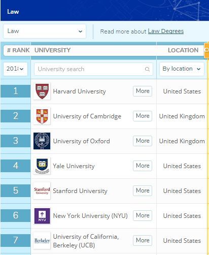 网络公开信息显示,国内的多所顶尖律所,入门级别律师的月薪已达到2万元及以上的水平。美国排名第一的律师事务所 Cravath,也在2018年确定上调律师薪资,入门级律师年薪已达19万美元(约合127万元),律师成为极具发展潜力的职业之一。近日世界权威榜单发行机构QS(Quacquarelli Symonds)发布了2018法律专业世界大学排名,以下为榜单排名前20的大学: