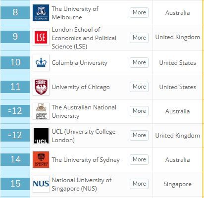 澳大利亚的墨尔本大学在本次位列第8名,是本次前十大学中仅有的非英美大学,这主要得得益于其高达98.9的雇主声誉得分,在世界大学中排名第3位。