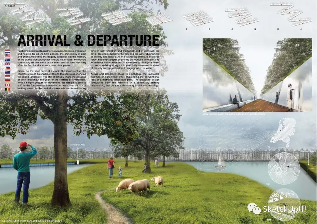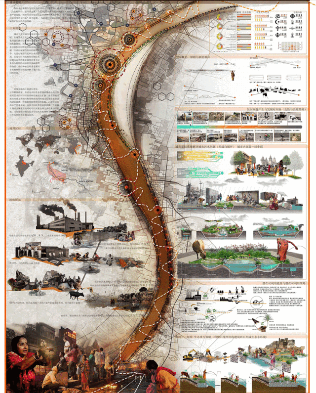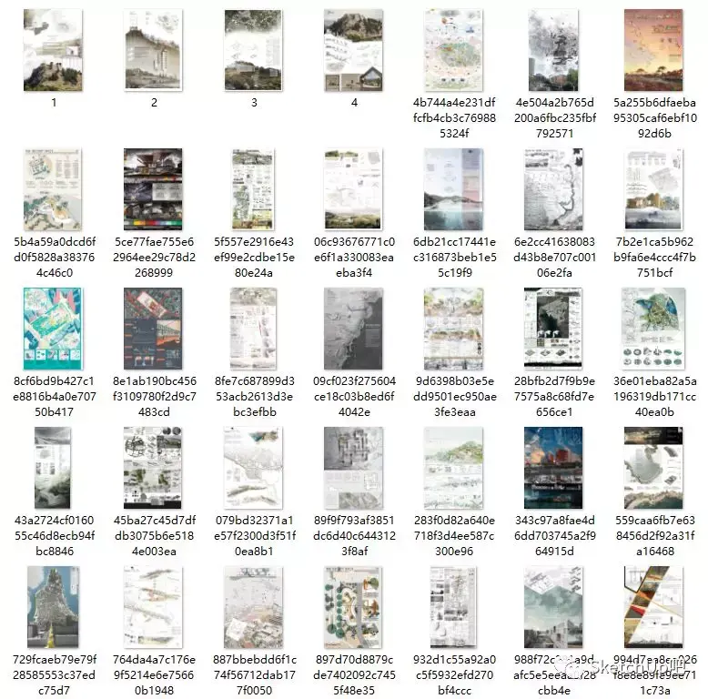 网格经过相互混合的版式,既理性、条理,又活泼而具有弹性。比如视频中的展板构图:背景连绵起伏的山体形成展板间的呼应,顶部放轻量感的分析图、底部放重量感透视大图压底,使整个版面和谐规整又有趣味。