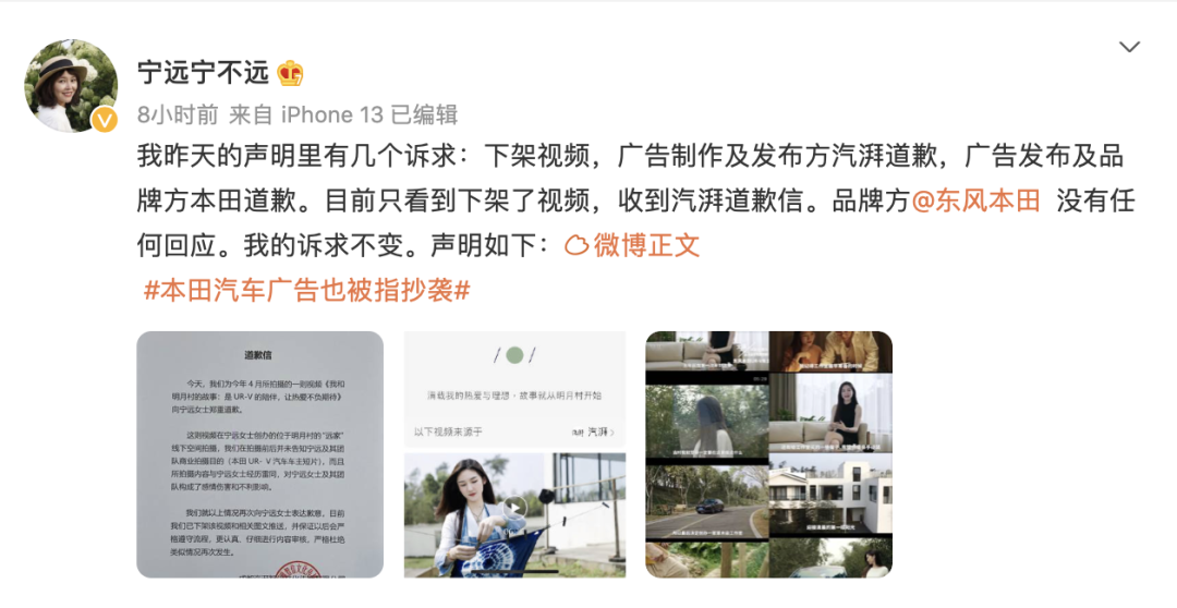东风本田的涉事广告代理公司成都汽湃智信文化传播有限公司发文表示,为今年4月所拍摄的一则视频《我和明月村的故事:是UR-V的陪伴,让热爱不负期待》向宁远女士郑重道歉。承认这则视频在宁远创办的“远家”线下空间拍摄,且公司在拍摄前后并未告知宁远及其团队商业拍摄目的。