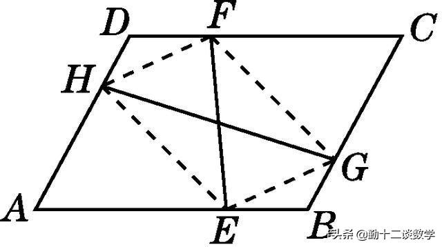 分析:证明EF与GH互相平分,证明两个三角形全等不容易实现,可以连接HE、EG、FG、HF,证明四边形HEGF为平行四边形,平行四边形的对角线互相平分。而要证明平行四边形,可以通过证明△HAE≌△GCF、△HDF≌△GBE,得到HF=EG、HE=FG,两组对边相等的四边形为平行四边形。