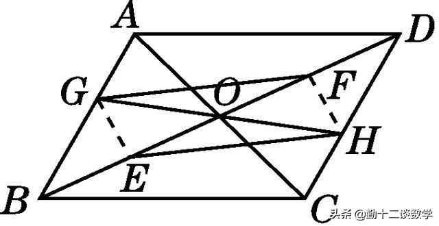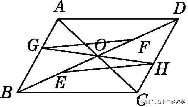 例题3:如图,平行四边形ABCD的对角线AC和BD相交于点O,E,F分别为OB,OD的中点,过点O任作一直线分别交AB,CD于点G,H.求证:GF∥EH.