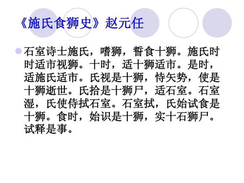 石(shí)室(shì)诗(shī)士(shì)施(shī)氏(shì),嗜(shì)狮(shī),誓(shì)食(shí)十(shí)狮(shī)。