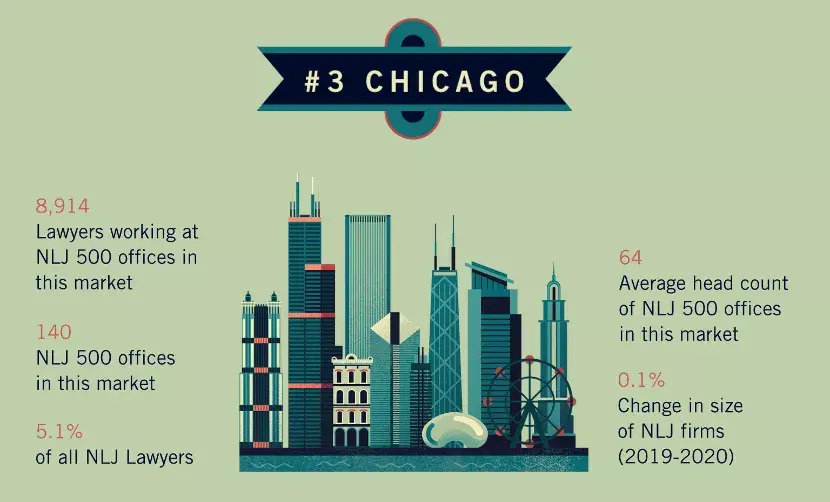 Chicago市拥有的美国The NLJ 500律所律师人数共8,914人,占据全部NLJ律师的5.1%,位居全美第3;有140家The NLJ 500律所在Chicago设置有办公室,每家律所Chicago办公室拥有的平均律师数为64人;与上一年度相比,Chicago拥有的NLJ律所数量增加了0.1%。