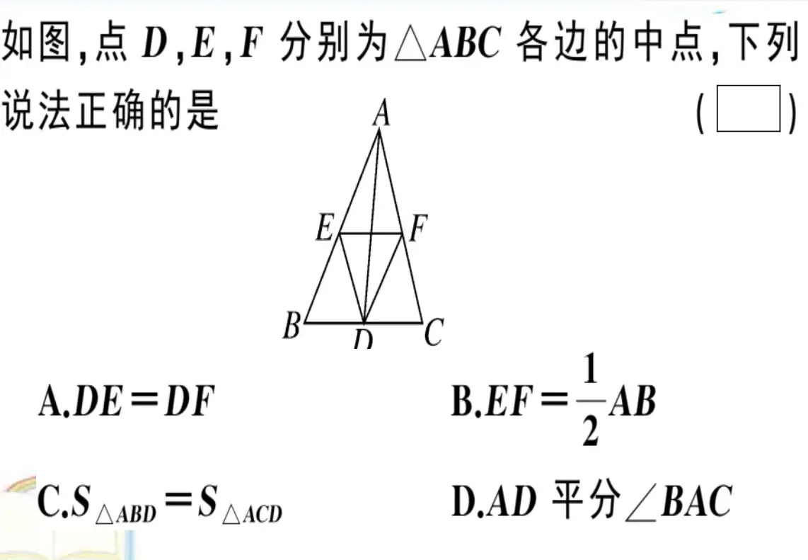 这是一道选择题。图中的三角形EDF即为中位三角形。先看A选项,如果DE=DF,则根据中位线定理,得到AC=AB,题目中的条件,不能得出三角形ABC一定是等腰三角形的结论,所以不正确。再看B选项,若成立,则2EF=AB,即BC=AB,也不一定,故不正确。C选项利用中线的性质和三角形等底同高面积相等的性质,可以证明。D选项可用反证法,加以证明,结论是不一定的。
