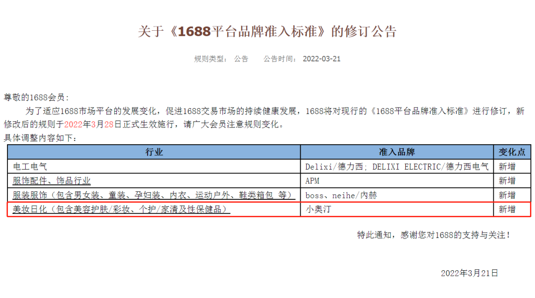 3月21日,1688平台发布公告称,将对现行的《1688平台品牌准入标准》进行修订,同时,其美妆日化行业准入品牌新增小奥汀。截至目前,1688美妆日化行业准入品牌数量已达379个,囊括了欧莱雅、雅诗兰黛、资生堂、完美日记、百雀羚、花西子、珀莱雅等众多国内外知名品牌。