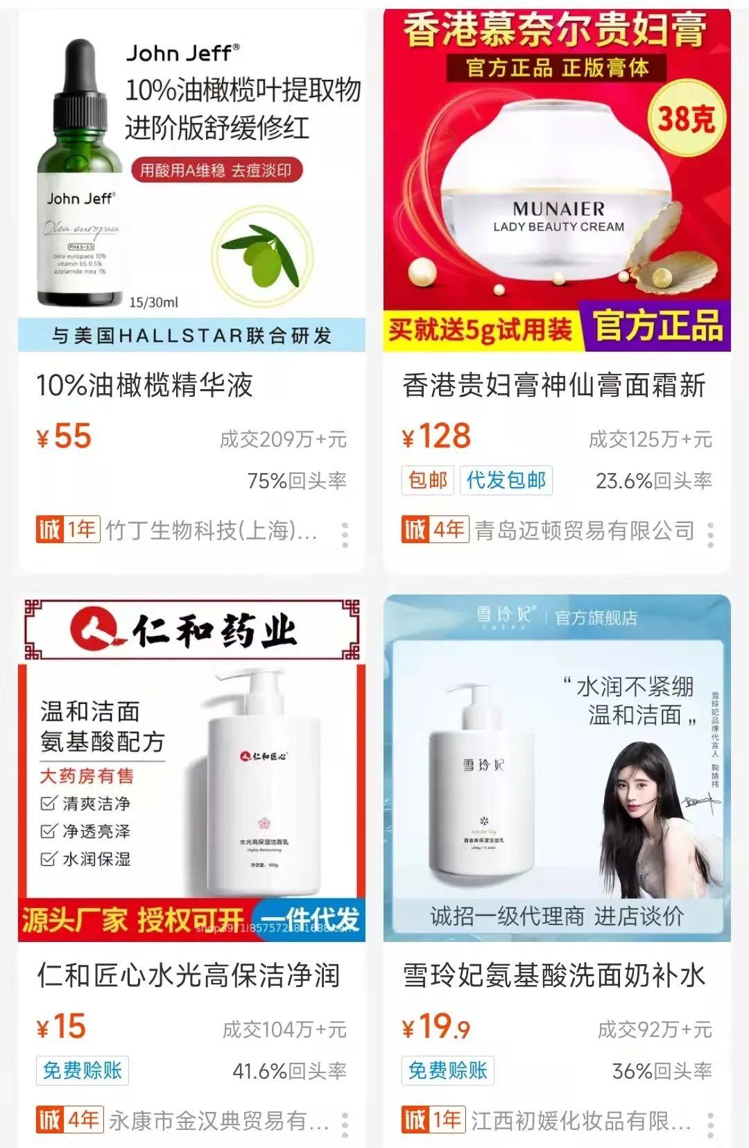 例如在1688化妆品成交额榜单位居前列的雪玲妃氨基酸洗面奶,其卖家为江西初媛化妆品有限公司,记者在天眼查查询发现,该公司法定代表人正是雪玲妃品牌创始人戴丽华,这是品牌入驻新渠道时的常规打法。