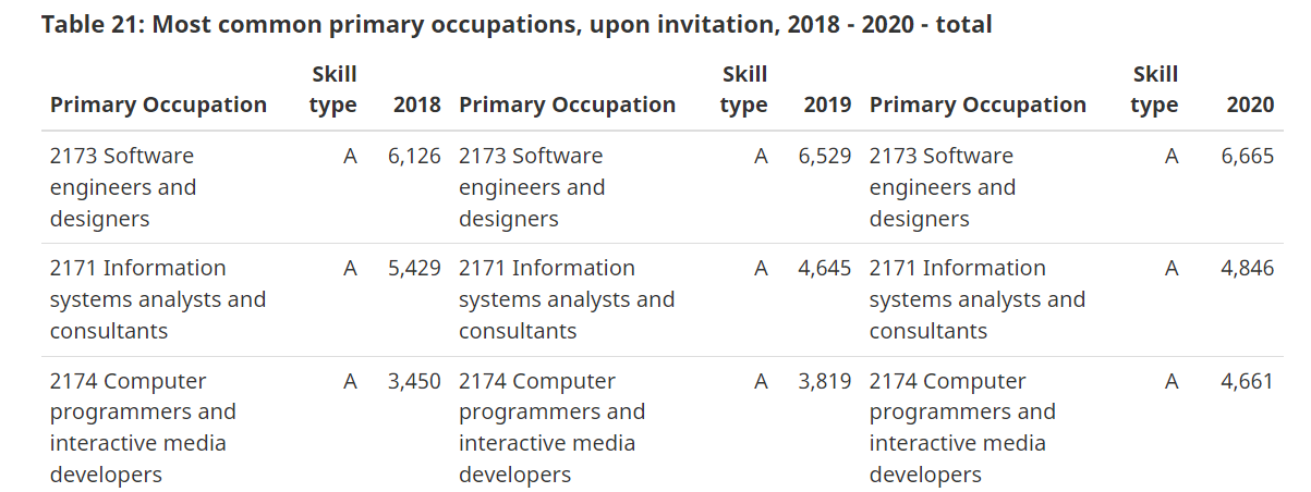 根据联邦移民局公布的2018-2020年数据统计,我们可以看到仅2020年,从事IT相关工作的申请人走联邦EE的就有16172人,占总比例的15%,这还不算省提名的,因为省提名中,IT类相关的工作,是更容易获得移民提名资质的。
