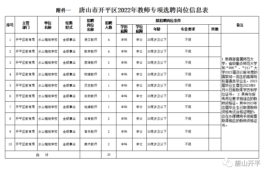 (二)具体选聘人数和岗位条件详见《唐山市开平区2022年教师专项选聘岗位信息表》(附件一)。根据我区学校选聘进展情况可动态调整选聘数额。