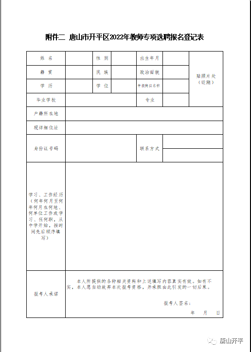 (5)唐山市开平区2022年教师专项选聘报名表。