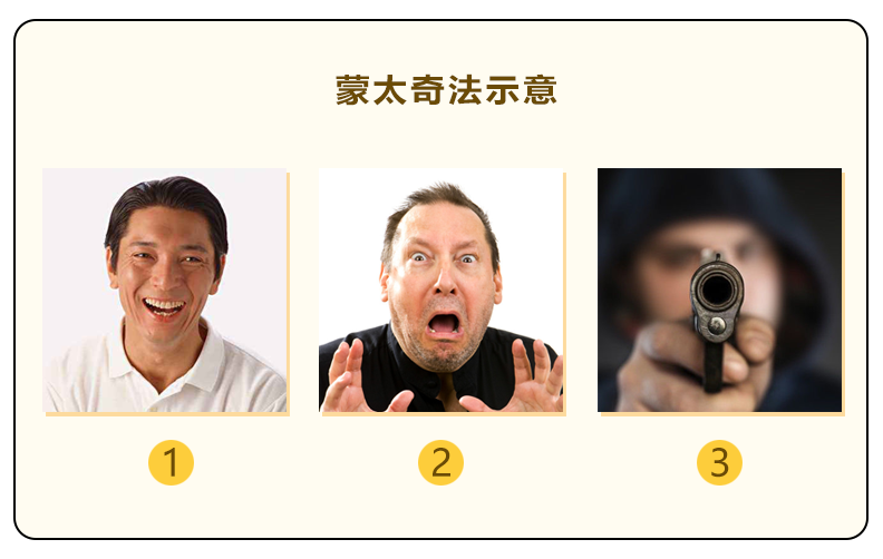 按照现在1、2、3的顺序排列,我会马上想到:正当这个人非常开心的时候,突然脸色大变,原来是一把枪对准了他。你也是这样想的吧?