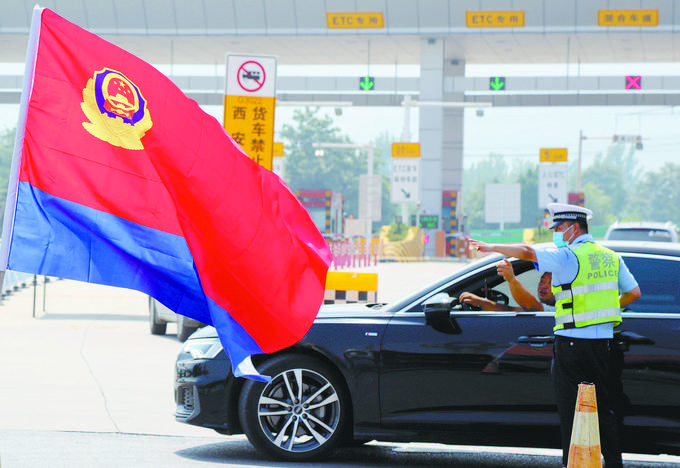 8月18日,陕西省渭南市公安局交警支队临渭大队民警在渭南东高速疫情防控点指挥引导车辆有序通行。张亮摄