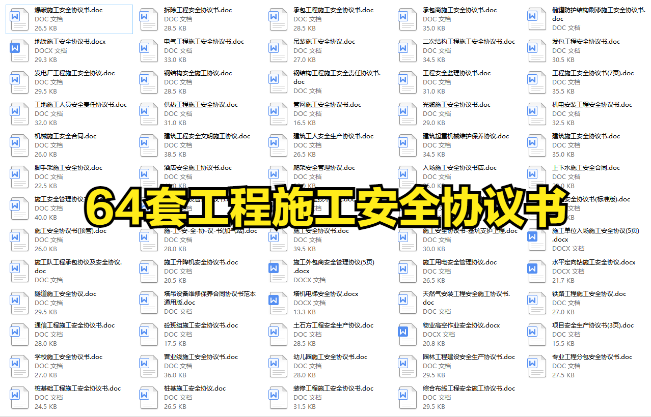 这64套工程施工安全协议书,包含爆破施工安全协议书、拆除工程安全协议书、承包工程施工安全协议书、地铁施工安全协议书、电气工程施工安全协议书、吊装施工安全协议等,word格式,模板可编辑,打印使用,方便快捷!