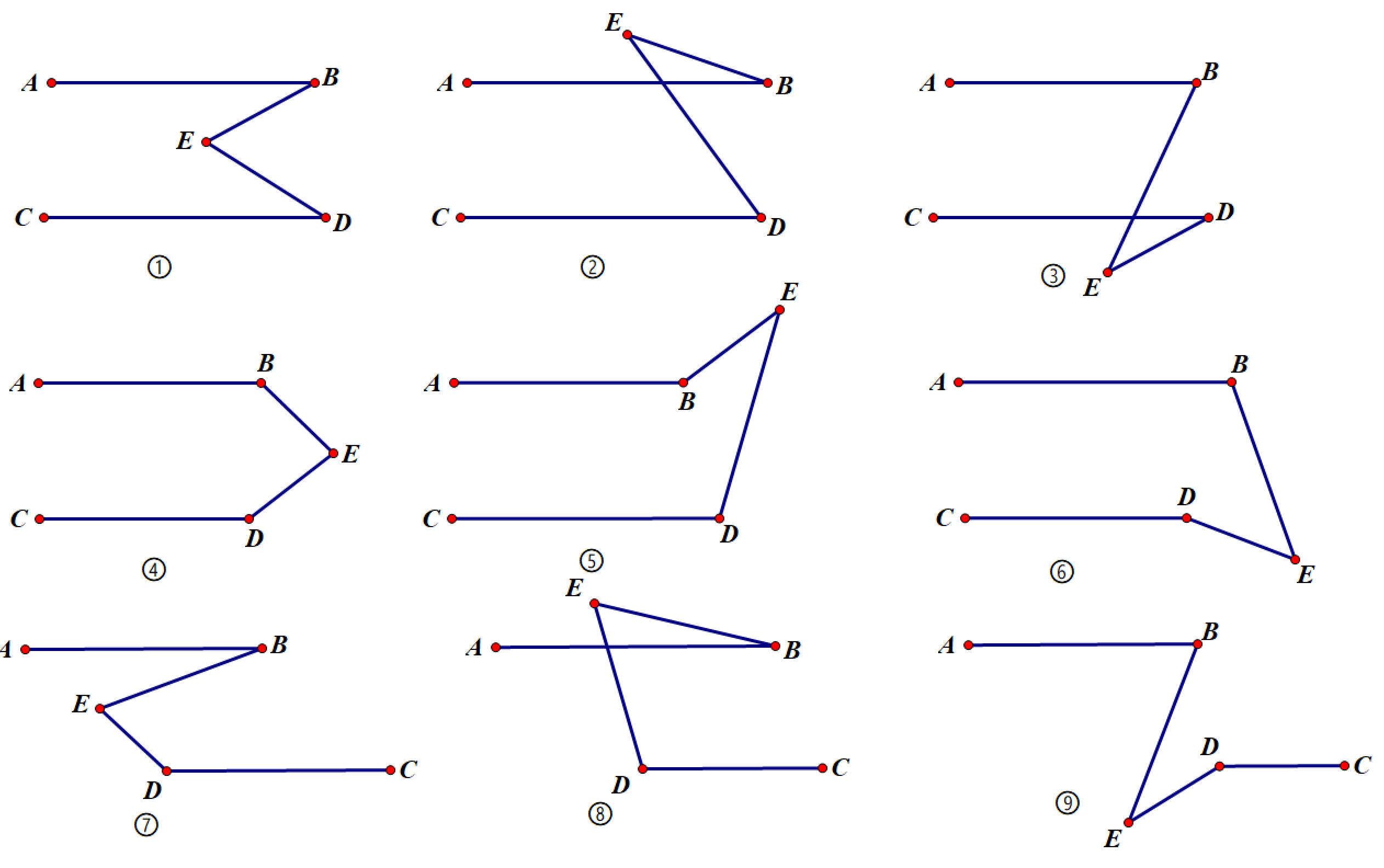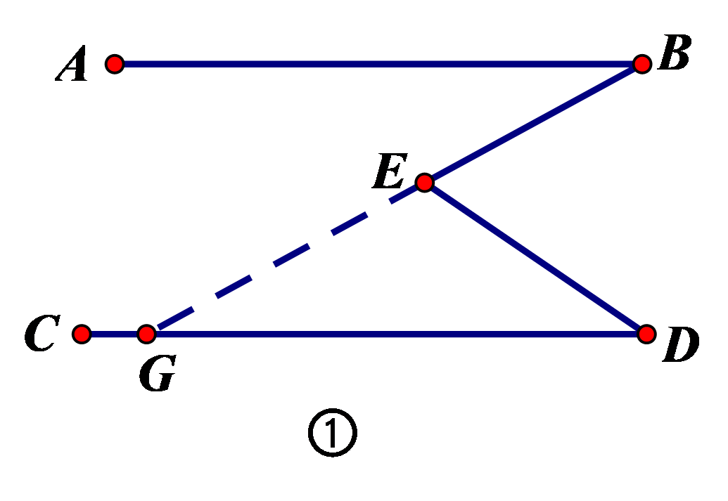 已知AB∥CD,请大家分别探索以下图形中∠B、∠D、∠E的数量关系?