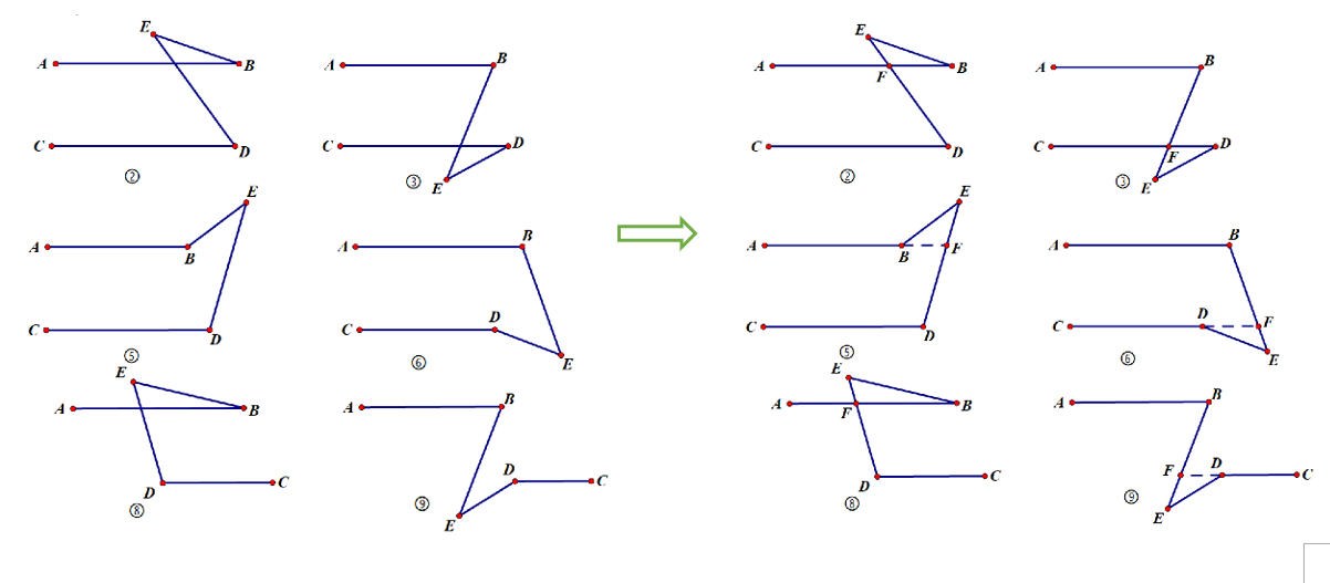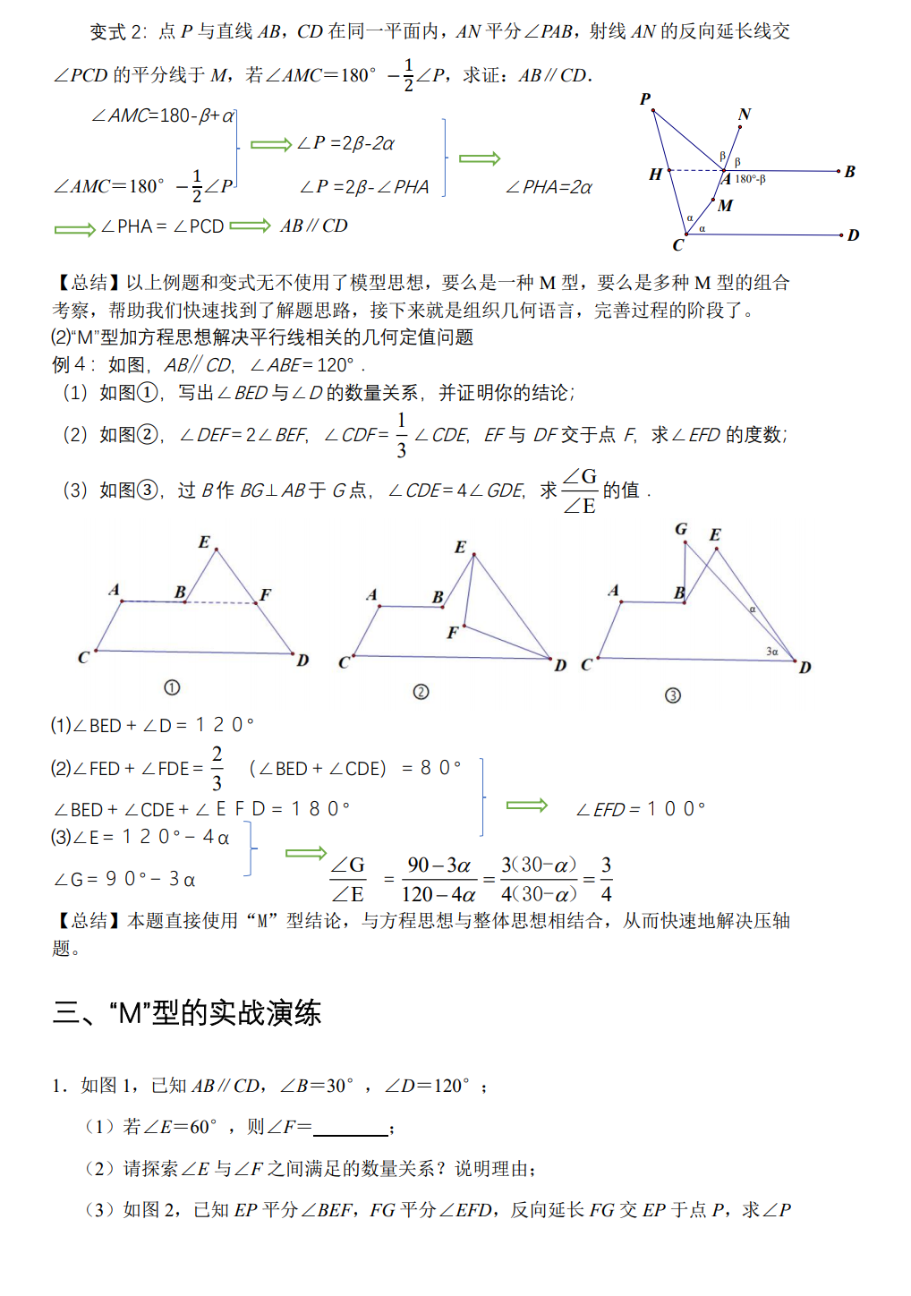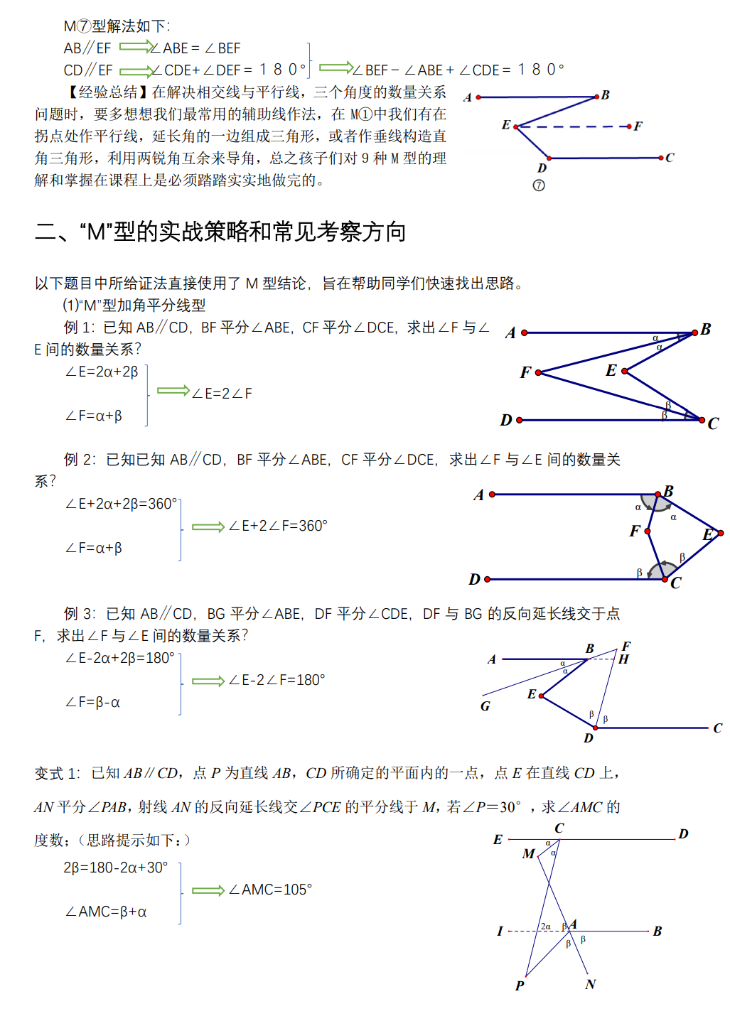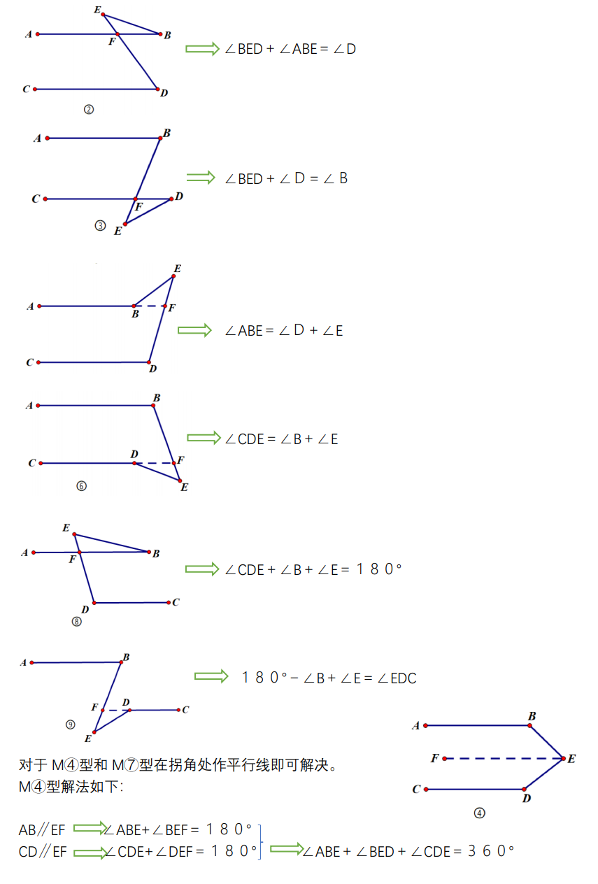 其中以上六种都可以使用M①型中法三进行证明,即是用三角形内角和定理去推导外角和定理,也可以帮学生快速看出解题方法和套路。大家可以尝试去得出这六个M型的结论,基本上一看便知!(此处省略具体证法)