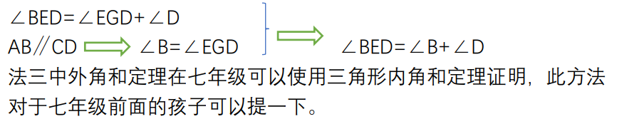 法三中外角和定理在七年级可以使用三角形内角和定理证明,此方法